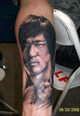 is Bruce Lee - a great martial artist. This guy is such a big fan to get Bruce Lee inked on his arm.